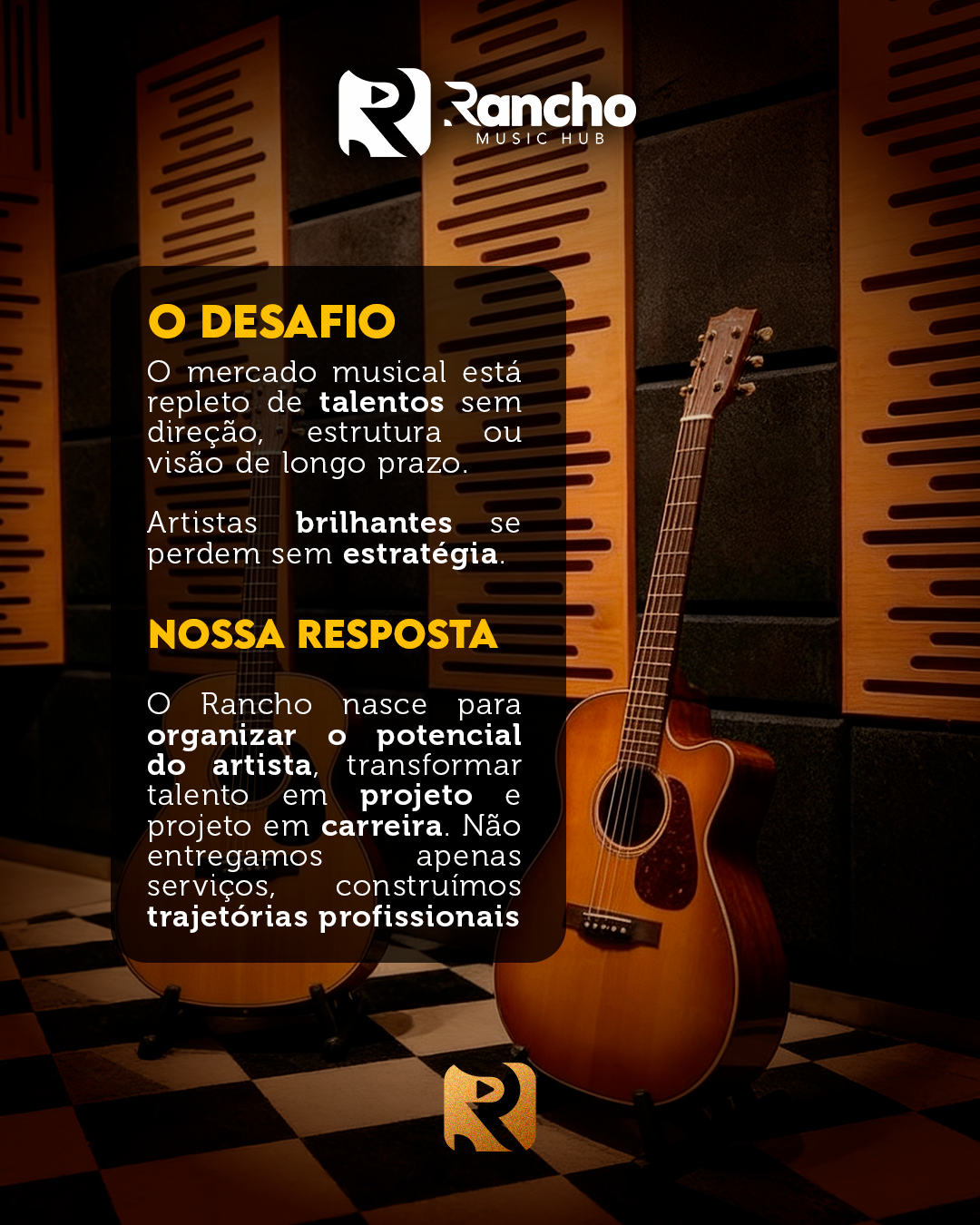 O Rancho Music Hub é um Hub de serviços musicais, oferecendo soluções completas para artistas em todas as fases da carreira. Fundado por dois profissionais com vasta experiência no mercado musical e de eventos.